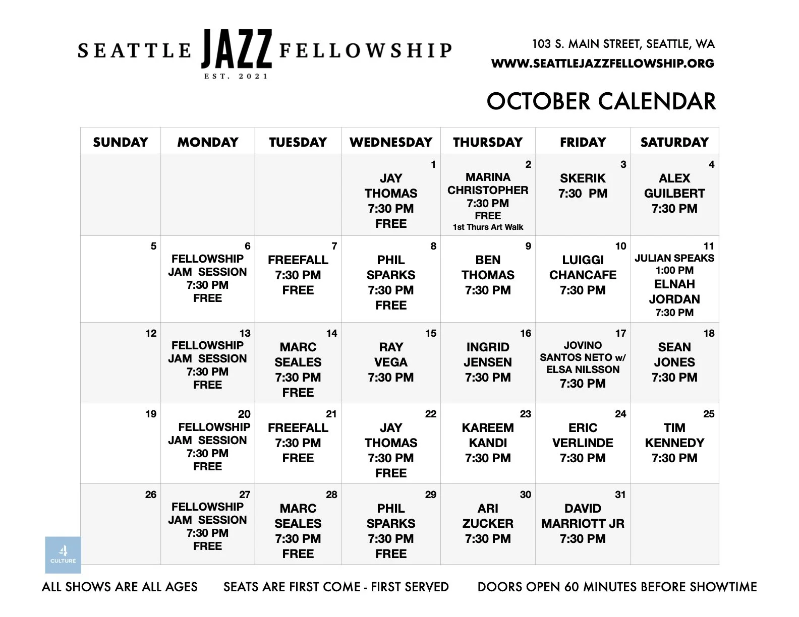 The mission of the Seattle Jazz Fellowship is to build community, provide access to the mentorship cycle, incentivize excellence and lower barriers to access for both performers and listeners of jazz, a creation of Black American culture and struggle.